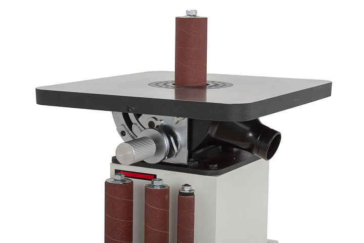 Станок поставляется в комплекте с набором из 5-ти сменных шлифовальных шпинделей и втулок, предназначенных для работы с радиусами разного калибра. В зависимости от него меняется и вставка в стол. 6 вставок стола в стандартном комплекте. При работе с наклоном монтируют вставку с овальным отверстием.