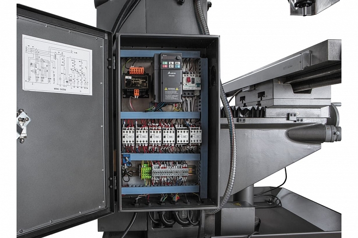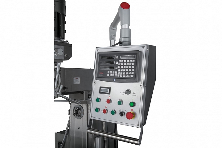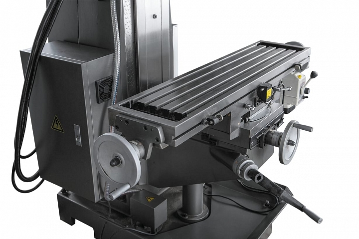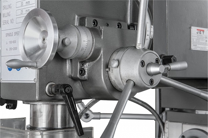 На станке JMD-939GHV DRO можно производить сверление отверстий до диаметра 30 мм и фрезеровать концевыми фрезами до диаметра 20 мм. На станке установлены вертикальный и горизонтальный шпиндели со скоростями вращения 100-2000 / 60-1350 об/мин соответственно. Расстояния между вертикальным шпинделем и столом от 70 до 370 мм, вертикальным шпинделем и поверхностью колонны от 250 до 650 мм; горизонтальный шпиндель-стол – от 20 до 320мм. Выбор скоростей вертикального шпинделя осуществляется с помощью бесступенчатой регулировки частоты вращения шпинделя с ее индикацией на пульте управления. Скорость вращения горизонтального шпинделя изменяется посредством клиноременных передач.