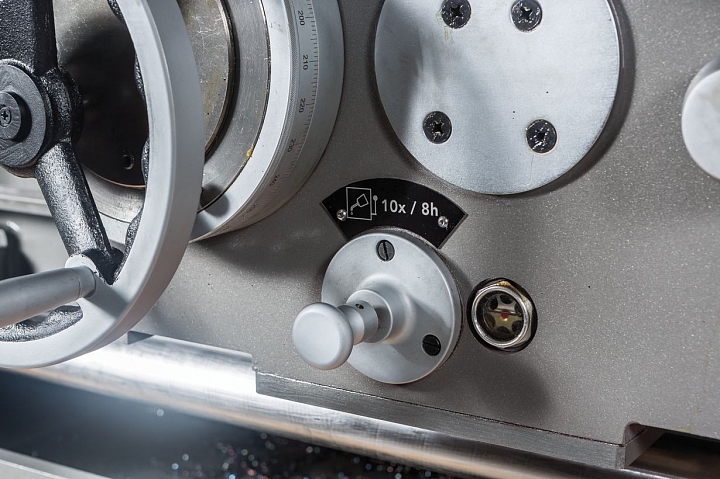Коробка подач GH-2640 ZH DRO имеет 65 режимов продольных и поперечных автоматических подач для нарезки метрической, дюймовой, модульной и питчевой резьб. При этом частота биений на шпинделе не превышает 9 микрон. Станок помещен на массивную станину из высокотехнологичного чугуна, что позволяет эффективно гасить вибрации и отводить тепло. Направляющие станины подготавливаются по фирменной технологии производителя. Предусмотрены ускоренное перемещение суппорта, педаль тормоза и аварийного отключения.