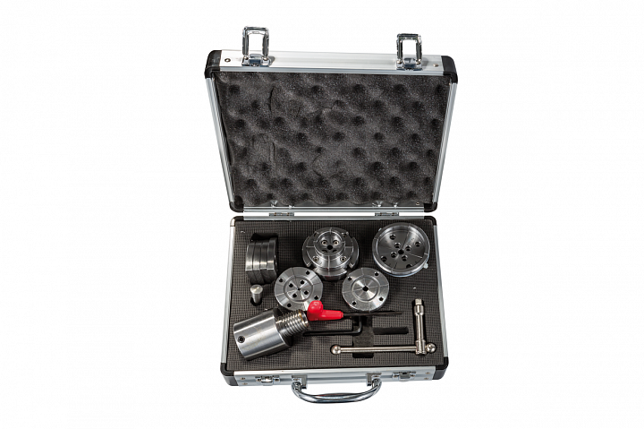 Токарный патрон, диаметр 70 мм, присоединительная резьба 1х8''TPI, комплект сменных кулачков, адаптер с 1х8''TPI на M33х3.5, зажимной ключ под квадрат, делительное приспособление на патроне, винтовая вставка, ключ шестигранный, кейс.