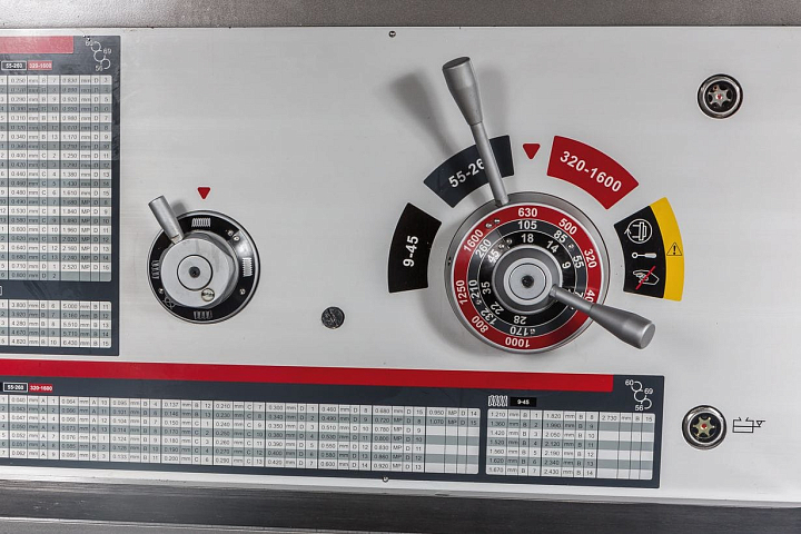 Пониженная скорость 9 об/мин выставляется при необходимости нарезания резьбы плашкой. На станке предустановлены 80 режимов продольных и поперечных подач, что позволяет нарезать метрическую, дюймовую, модульную и питчевую резьбы с повышенным уровнем точности. При этом биение на шпинделе не превышает 9 микрон. Привод шпинделя постоянно находятся в масляной ванне, что способствует охлаждению, снижает уровень шума и продлевает срок эксплуатации станка. Для уменьшения вибраций и качественного теплоотвода от инструмента и шпинделя станок установлен на массивную станину из особопрочного чугуна.
